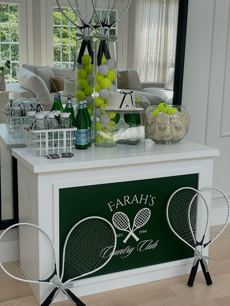 To grab attention and to further your theme, use elements of tennis as decor, such as tennis balls and tennis rackets, preferably white or vintage rackets. Use them sparingly, so if you use tennis balls for centerpieces, you don’t also need to use them on the food table.