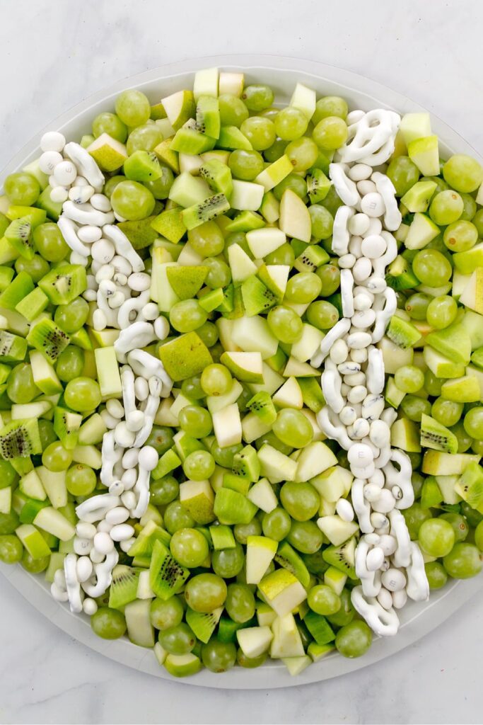 A fruit tray works well no matter the event, but especially at something like a brunch-style party or a viewing party. It is also incredibly easy to make. You can customize the fruit and snacks and their ratios to fit your preferences. I would swap out the white snacks with white cheeses instead!